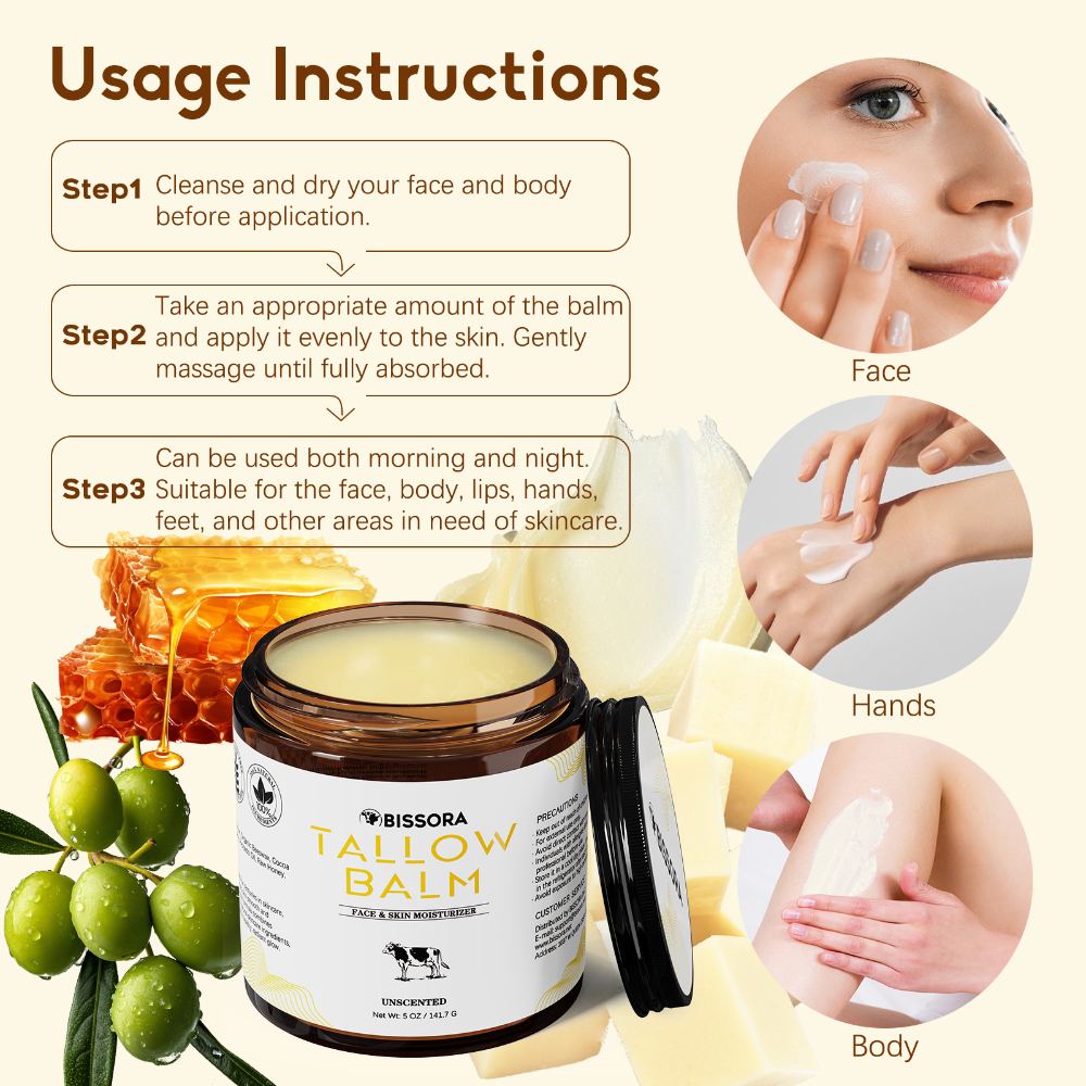 Suitable for All Skin Types: Gentle and non-comedogenic, our beef tallow for face is perfect for all skin types, including sensitive skin. It soothes redness, relieves dryness, and promotes a healthy, radiant complexion with our tallow and honey balm.