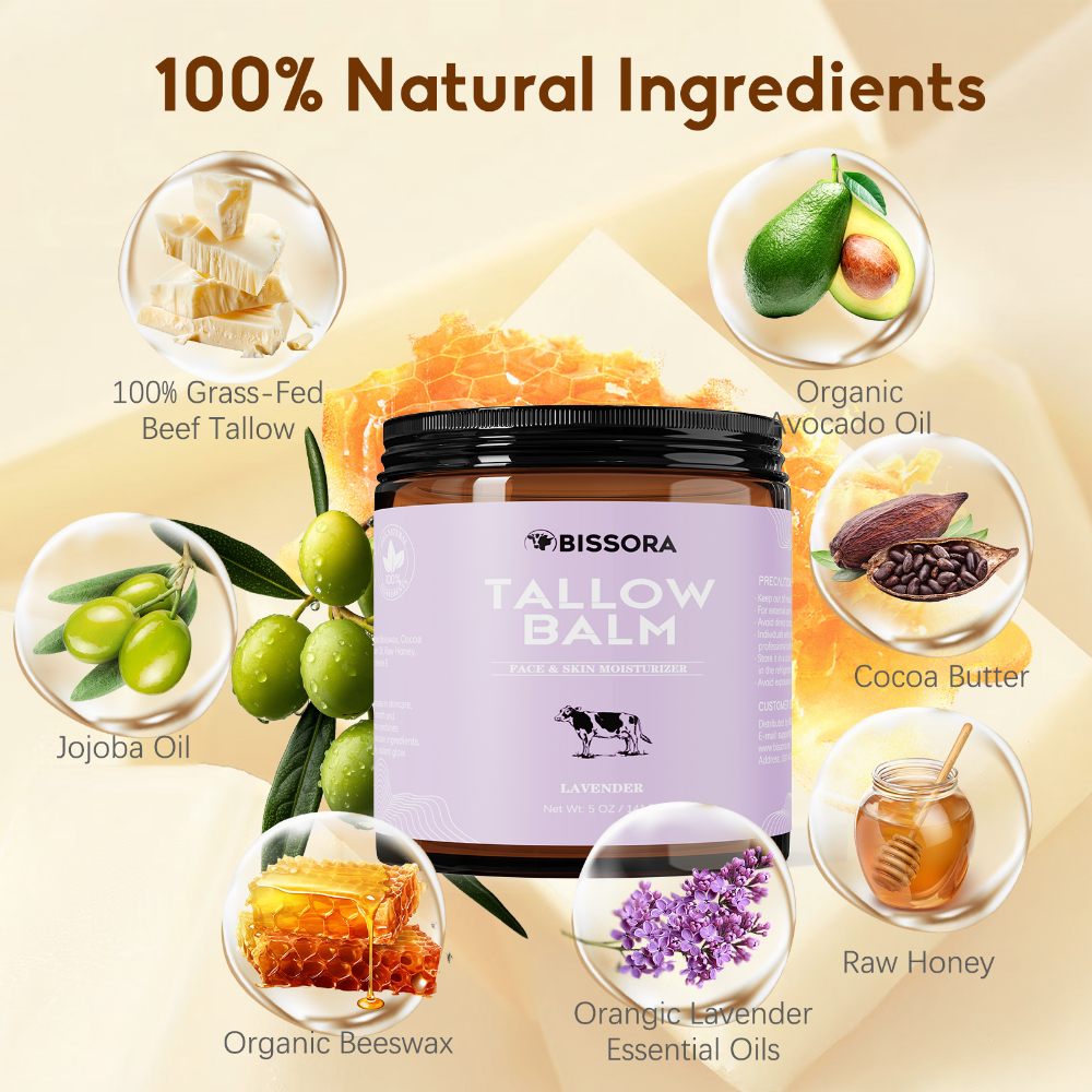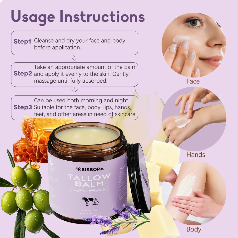 • Suitable for All Skin Types: Gentle and non-comedogenic, our beef tallow for face is perfect for all skin types, including sensitive skin. It soothes redness, relieves dryness, and promotes a healthy, radiant complexion with our tallow and honey balm.